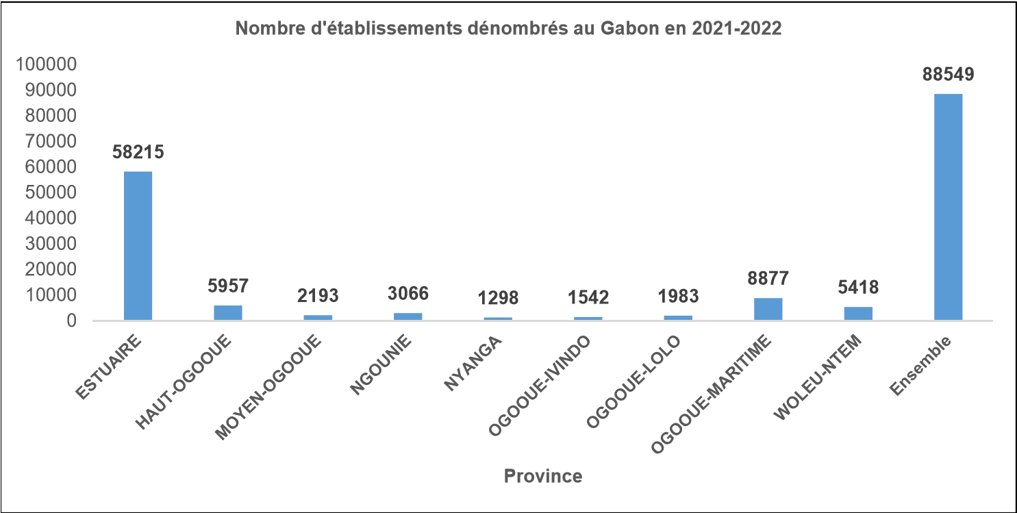 Dans l’ensemble du pays, 88549 établissements ont été localisés et dénombrés selon la répartition provinciale suivante : Estuaire (58215 établissements, soit 67,5%) ; Ogooué‐Maritime (8877 établissements, soit 10,0%) ; Haut‐Ogooué (5957 établissements, soit 6,7%) ; Woleu‐Ntem (5418 établissements, soit 6,1%) ; Ngounié (3066 établissements, soit 3,5%) ; Moyen‐Ogooué (2193 établissements, soit 2,5%) ; OgoouéLolo (1983 établissements, soit 2,2%) ; Ogooué‐Ivindo (1542 établissements, soit 1,7%) ; Nyanga (1298 établissements, soit 1,5%). Ainsi, il se dégage quatre provinces de forte concentration des entreprises et des institutions sans but lucratif, à savoir l’Estuaire, l’Ogooué‐Maritime, le HautOgooué et le Woleu‐Ntem. (Cf. Graphique 1)